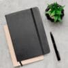 Agenda en cuerina, cocida y con caucho elástico para cierre. De 100 hojas con cuadricula de puntos. De 13.5 x 18 cm.