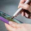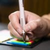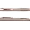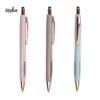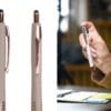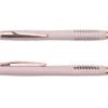 Bolígrafo con cuerpo de color sólido mate, suave al tacto, diseño sofisticado. Detalles metalizados rosa. Sistema de apertura retráctil con stylus para pantallas táctiles. En la parte inferior, contiene 2 detalles con hundimiento en forma de punta de flecha. (Bolígrafo/Esfero)