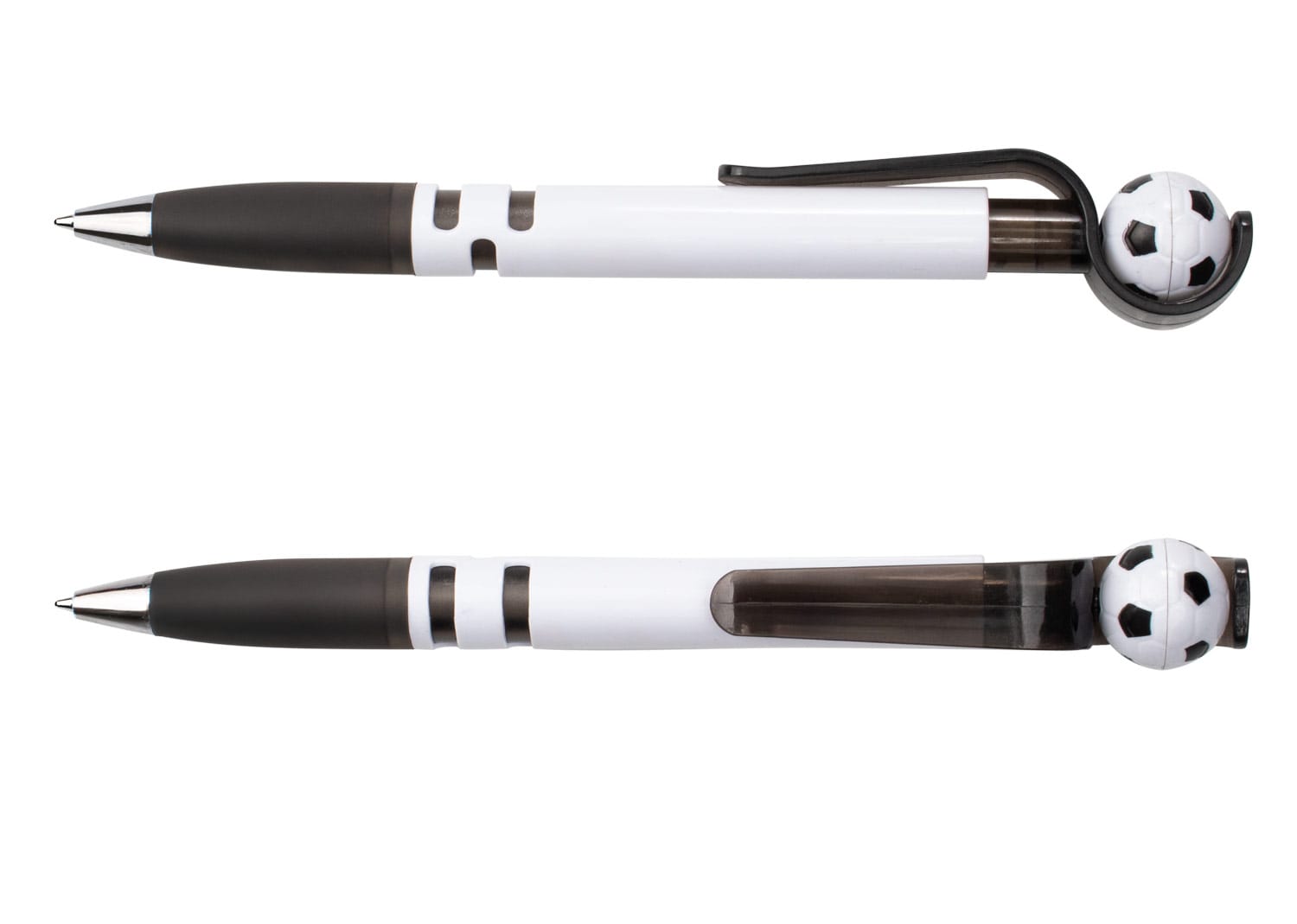 Con barril blanco sólido, clip y empujador traslúcidos que integran un mecanismo giratorio con balón de fútbol. Su empuñadura traslúcida brinda comodidad al escribir, mientras que la punta cromada aporta un toque moderno. El balón gira al impulsarlo, haciendo de este bolígrafo una opción divertida y funcional.