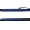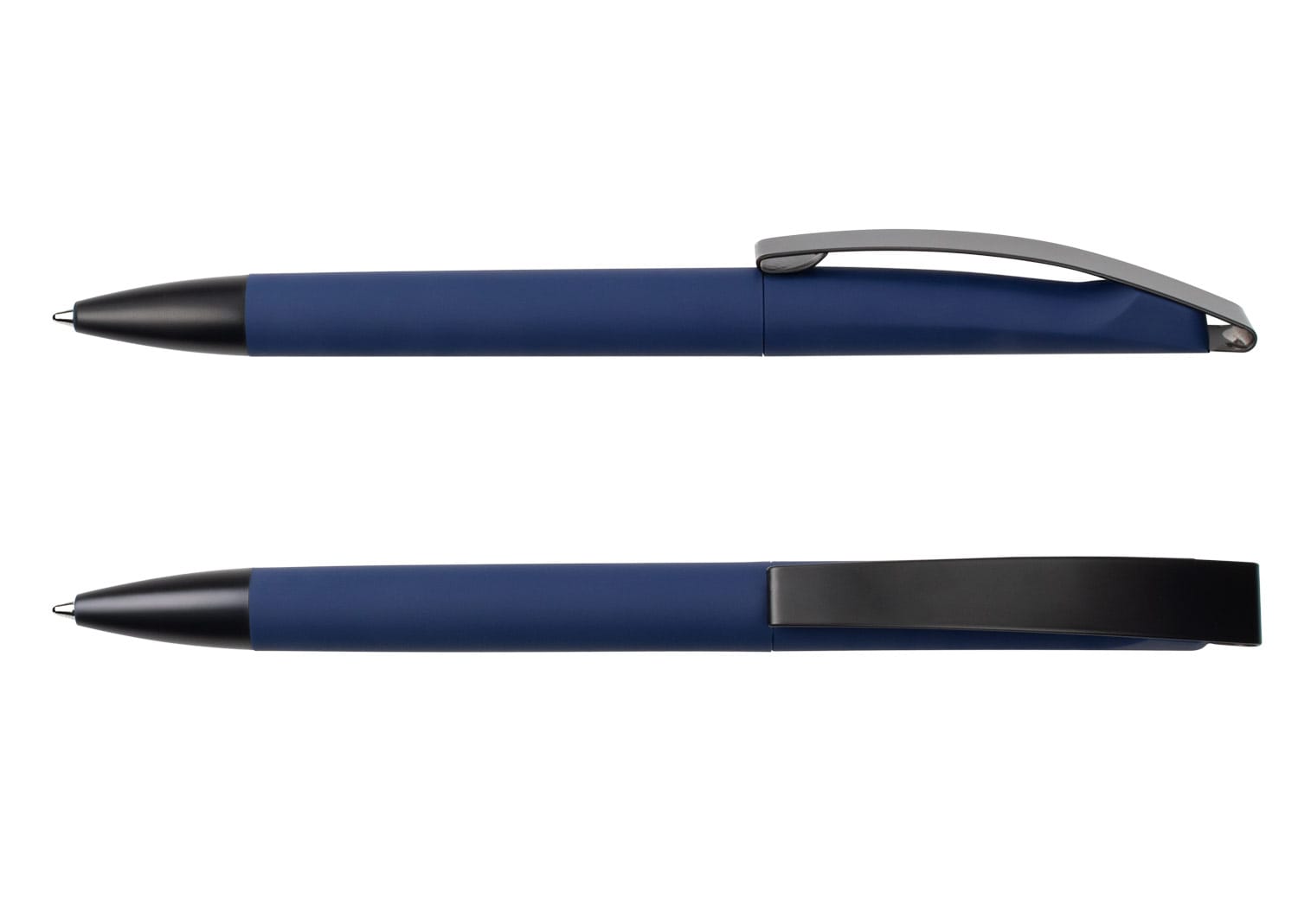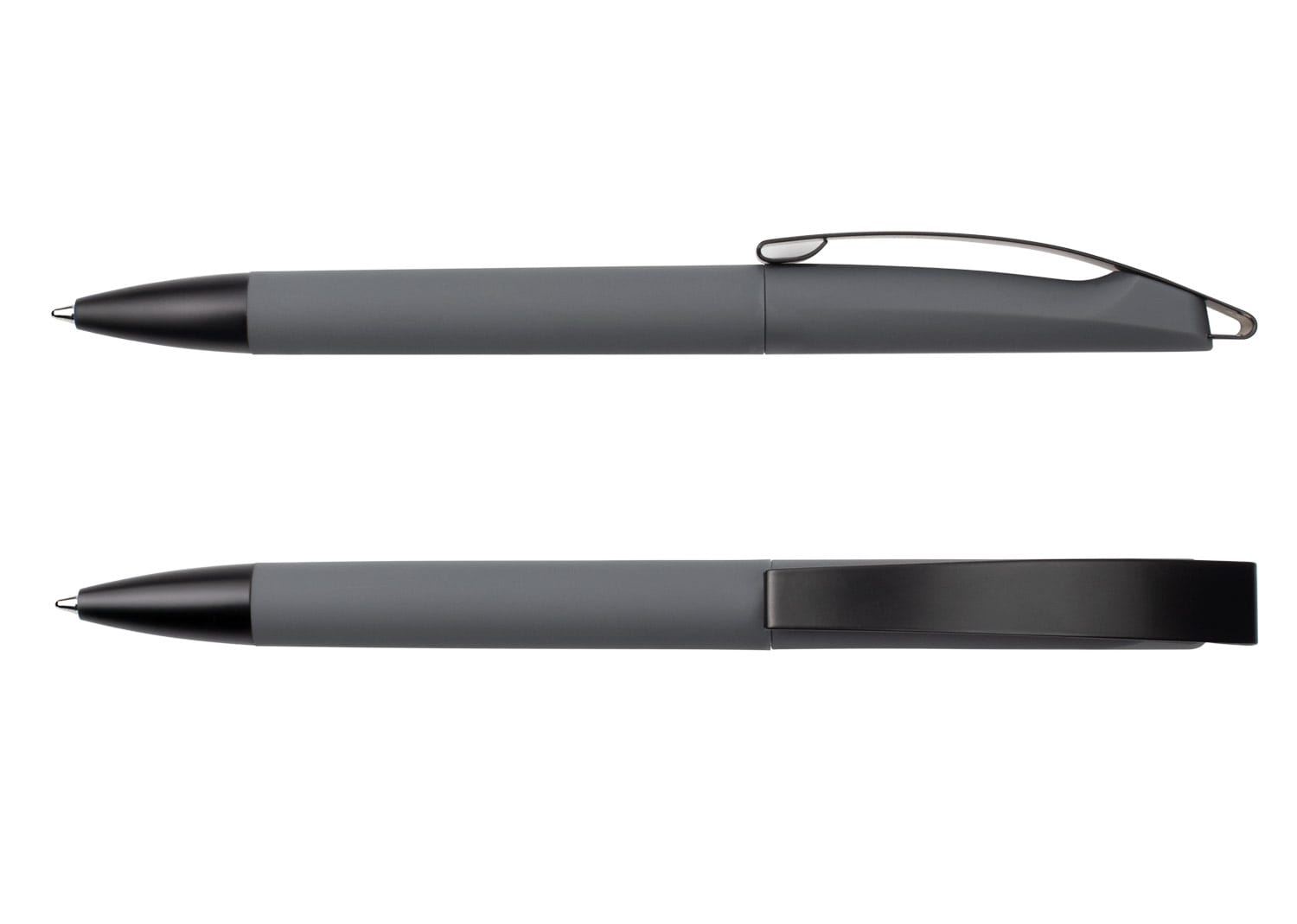 Bolígrafo con cuerpo en plástico ABS y barril engomado de color, que ofrece un agarre cómodo y seguro. Su punta negra mate aporta un acabado moderno, mientras que el clip de metal negro con base cromada permite sujetarlo fácilmente a cuadernos, bolsillos o carpetas. Ideal para uso diario en entornos laborales o académicos.