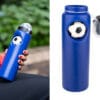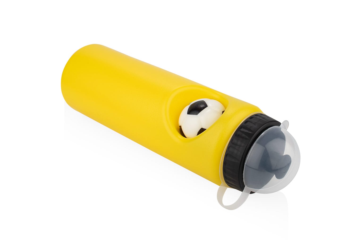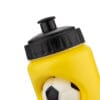 Botella deportiva de PE, ideal para actividades físicas. Su diseño incluye un antiestrés con forma de balón de fútbol (Ø 4,7), que se puede insertar y retirar del cuerpo de la botella, ofreciendo una función lúdica y relajante. Cuenta con tapa con boquilla de cierre giratorio para un consumo práctico, y un protector con asa que cubre la boquilla, manteniéndola limpia y facilitando su transporte. Capacidad: 800 ml / 27 Oz.
