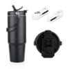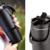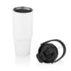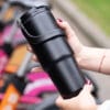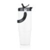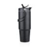 Esta botella metálica es ideal para todo tipo de bebidas. Cuenta con una manija resistente, integrada en la tapa mediante una sólida pieza de metal, que facilita su transporte y almacenamiento. Dispone de dos boquillas para el consumo de líquidos: una tipo boquilla y otra tipo pitillo, ambas con tapas de seguridad. Además, posee un borde de caucho que previene derrames. Capacidad 1000 ml / 32 Oz.