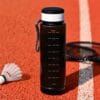 Elaborada en RPET. Capaciadd de 1 litro con indicador de medidas. Tapa pastillero, canastilla y cordón bicolor para colgar.