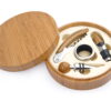 Contiene 4 accesorios de bar con aplique en madera: Tapón para botella, cortagotas, aro antigoteo, sacacorchos de 1 tiempo. Caja interior beige.