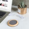 Calentador de mugs con base en acero inoxidable y cuerpo en laminado de madera.