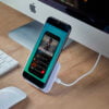 Cargador inalámbrico de escritorio para smartphone. Compatible con la mayoría de dispositivos comerciales que cuenten con tecnología de carga inalámbrica. Potencia de carga de 5W. Función de soporte para smartphone. Incluye cable cargador.