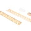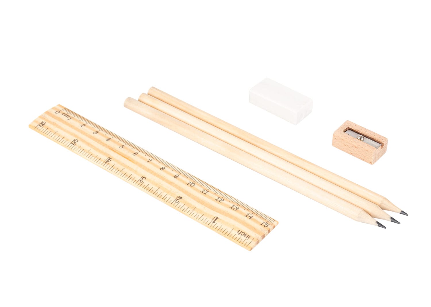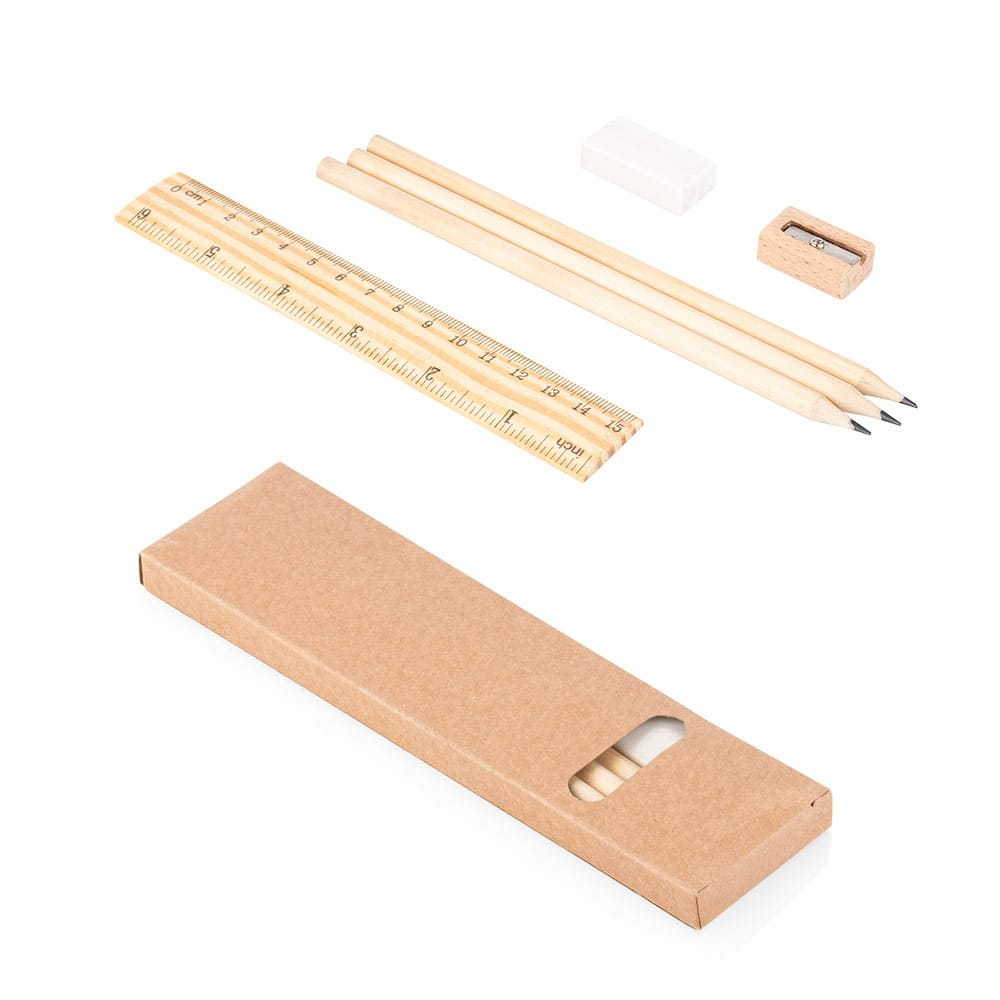Este juego de lápices viene en una caja de papel que incluye tres lápices (17,7 X Ø 0,4), una regla de madera con medidas en centímetros (15) y pulgadas (6″), un sacapuntas (1,6 X 2,7 X 1,1) y borrador (3,5 X 1,9 X 1) en su interior. Es una opción práctica y compacta para llevar lo esencial de papelería en un solo estuche.