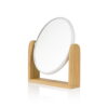 Espejo de tocador de doble cara, uno de ellos con aumento de 2X, puede girar sobre su eje hasta 360 grados. Base de madera.