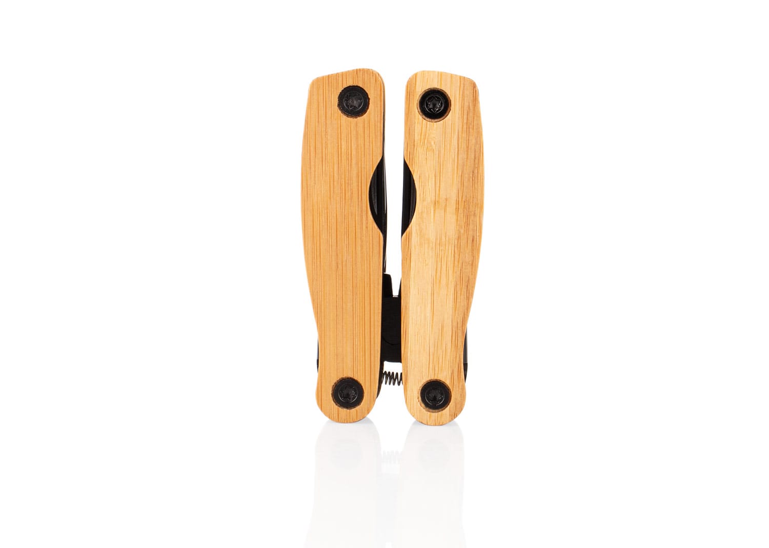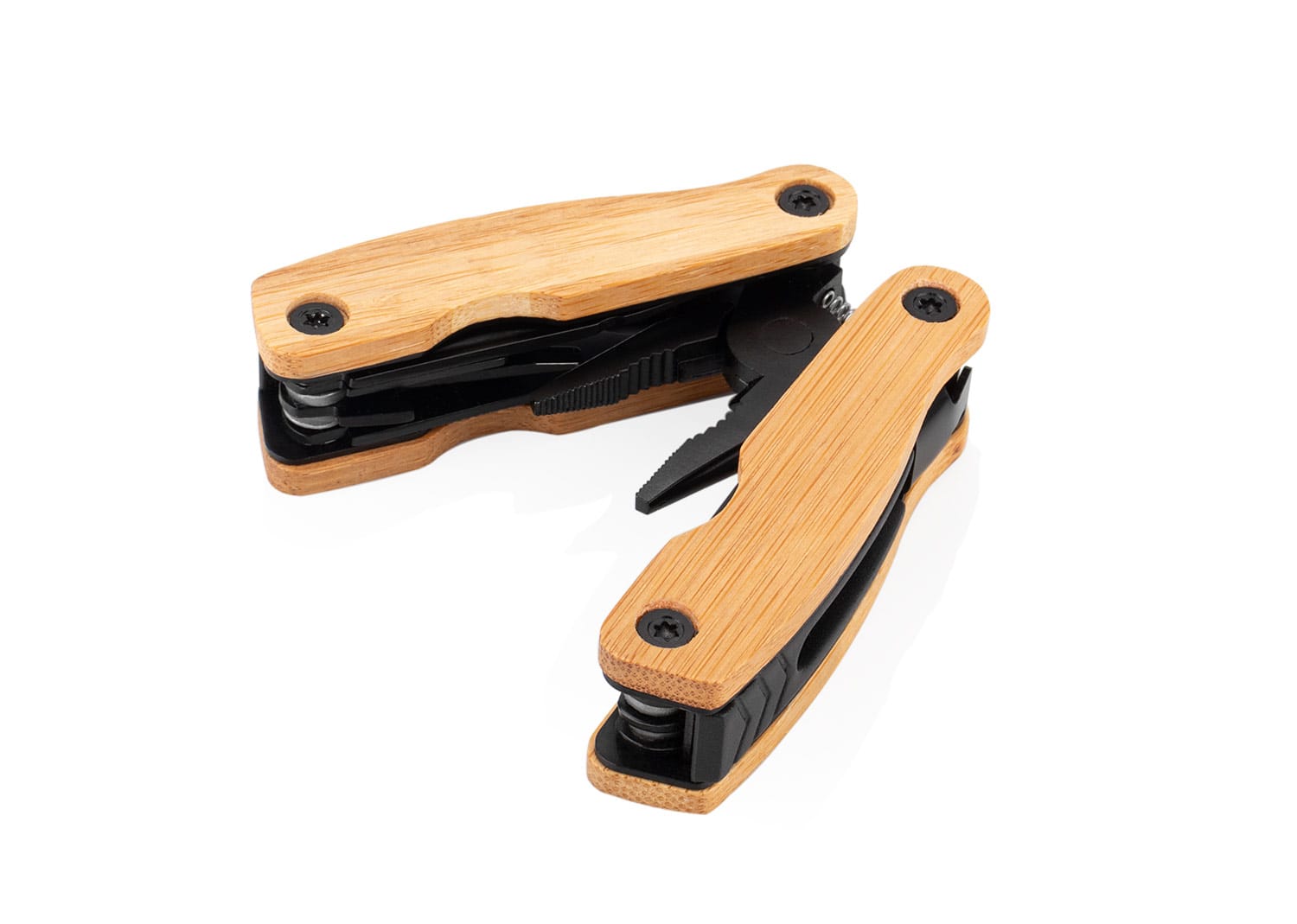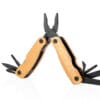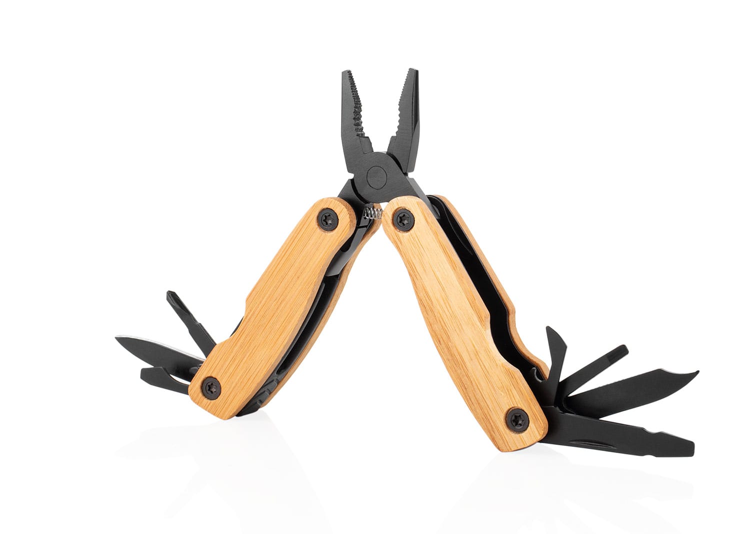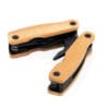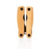 Esta herramienta multifunción cuenta con un diseño plegable y mango de madera, e integra alicates de punta fina y alicate regular (5,2 X 10,1), destornillador estrella (0,4 X 2,6) y pala (0,8 X 4), lima de uñas (0,8 X 3,6), abrelatas con removedor de ganchos, cuchillo (0,8 X 3,5), abrebotellas y sierra (0,6 X 3,6). Su formato compacto permite llevarla fácilmente y tener a la mano las funciones básicas para tareas cotidianas.