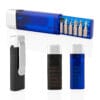 Este herramientero multifuncional cuenta con una linterna que se activa al deslizar un botón lateral. En la parte inferior incluye un compartimiento desplegable con seis puntas de destornillador, que pueden colocarse en la parte superior para su uso. El compartimiento se cierra bajo presión para mantener las piezas seguras. Además, incorpora un clip lateral que permite sujetarlo fácilmente a la ropa, ideal para llevarlo siempre a la mano.