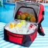 Interior plastificado impermeable. Bolsa principal, red interna para separar, bolsa frontal con cierre, bolsa lateral de red y correa ajustable. Capacidad para 12 latas.