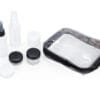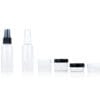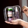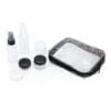 Set de viaje con estuche transparente en PVC con cremallera. Incluye frascos y envases reutilizables ideales para transportar líquidos, cremas o cosméticos de forma segura y práctica: Atomizadores: (11,5 X 2,5). Recipientes Medianos: (3,2 X 2,9). Recipientes Pequeños: (2 X 2,9). Perfecto para viajes o uso diario.