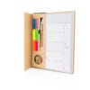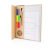 Set organizador con bloc de notas (23,8 × 12,6) que incluye 100 hojas con diseño semanal, ideal para organizar ordenadamente los apuntes de cada día. Contiene bolígrafo (14 × Ø 0,6 × 0,9), marcadores adhesivos de colores (4,4 × 1,2) y clips metálicos. Presentado en estuche de cartón rígido, práctico y funcional para el escritorio.
