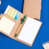 Set de libreta con 70 hojas blancas, 5 juegos de memos adhesivos en papel por 25 unidades c/u. de colores y bolígrafo. Tamaño aproximado: A6. Incluye porta bolígrafo.