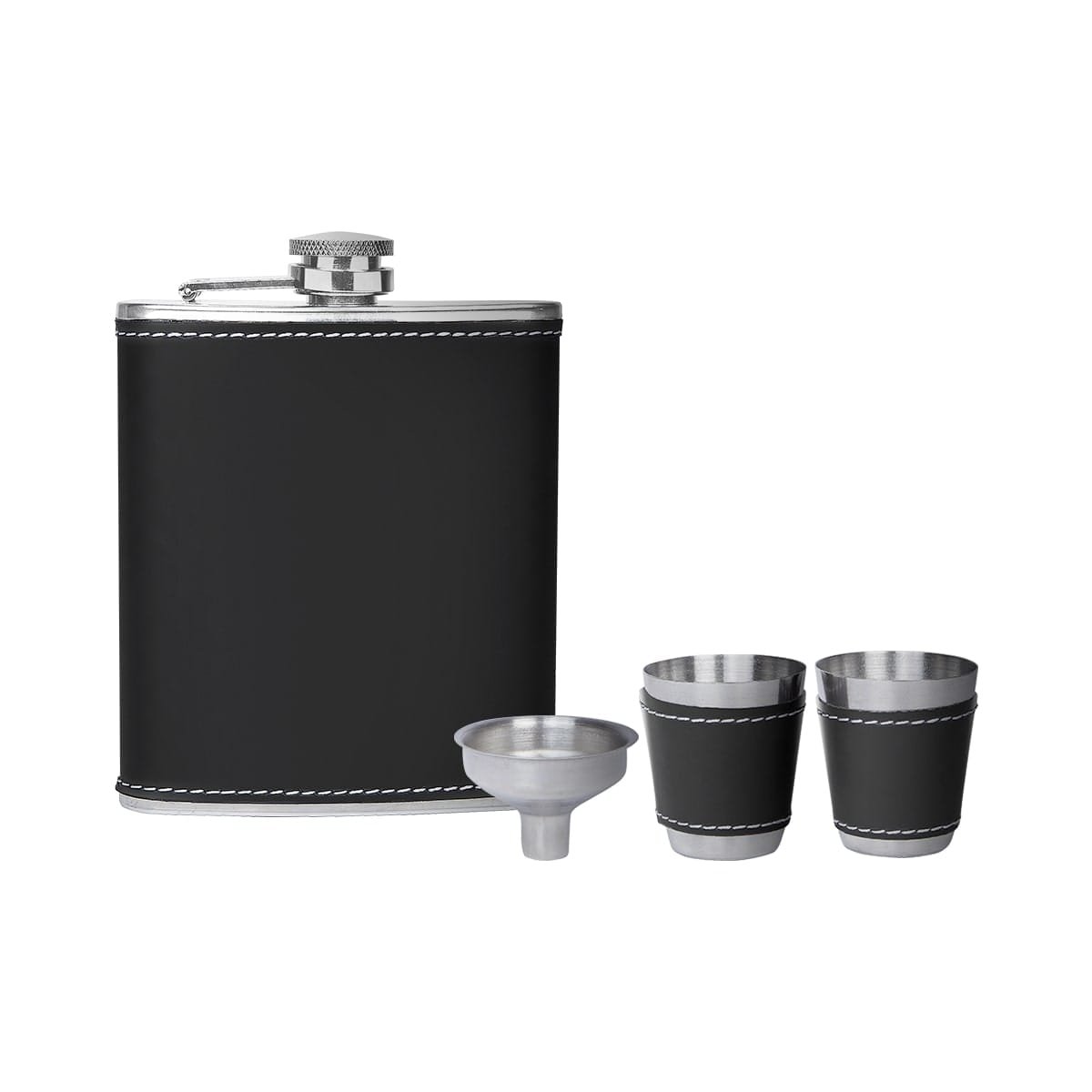 Set de licorera con tapa de rosca para evitar derrames, 2 vasos metálicos con manga de curpiel, 1 embudo y caja de regalo.