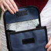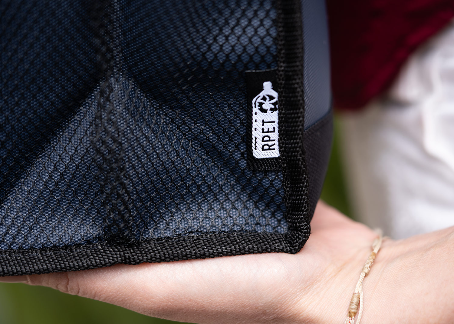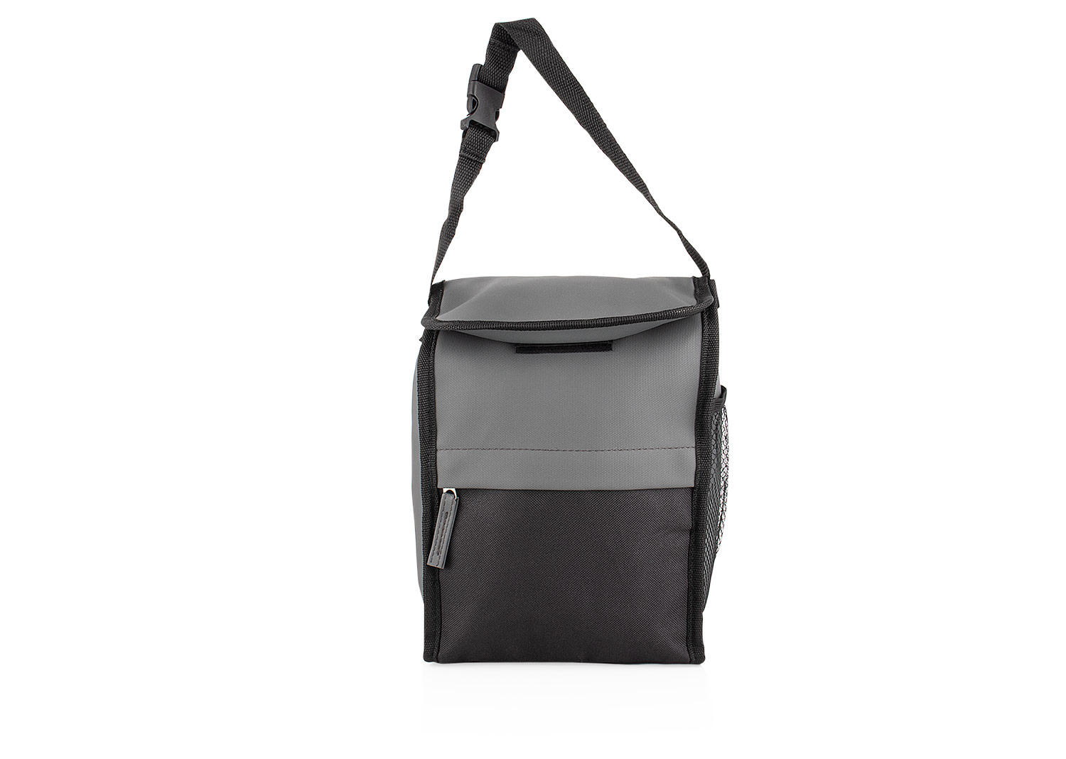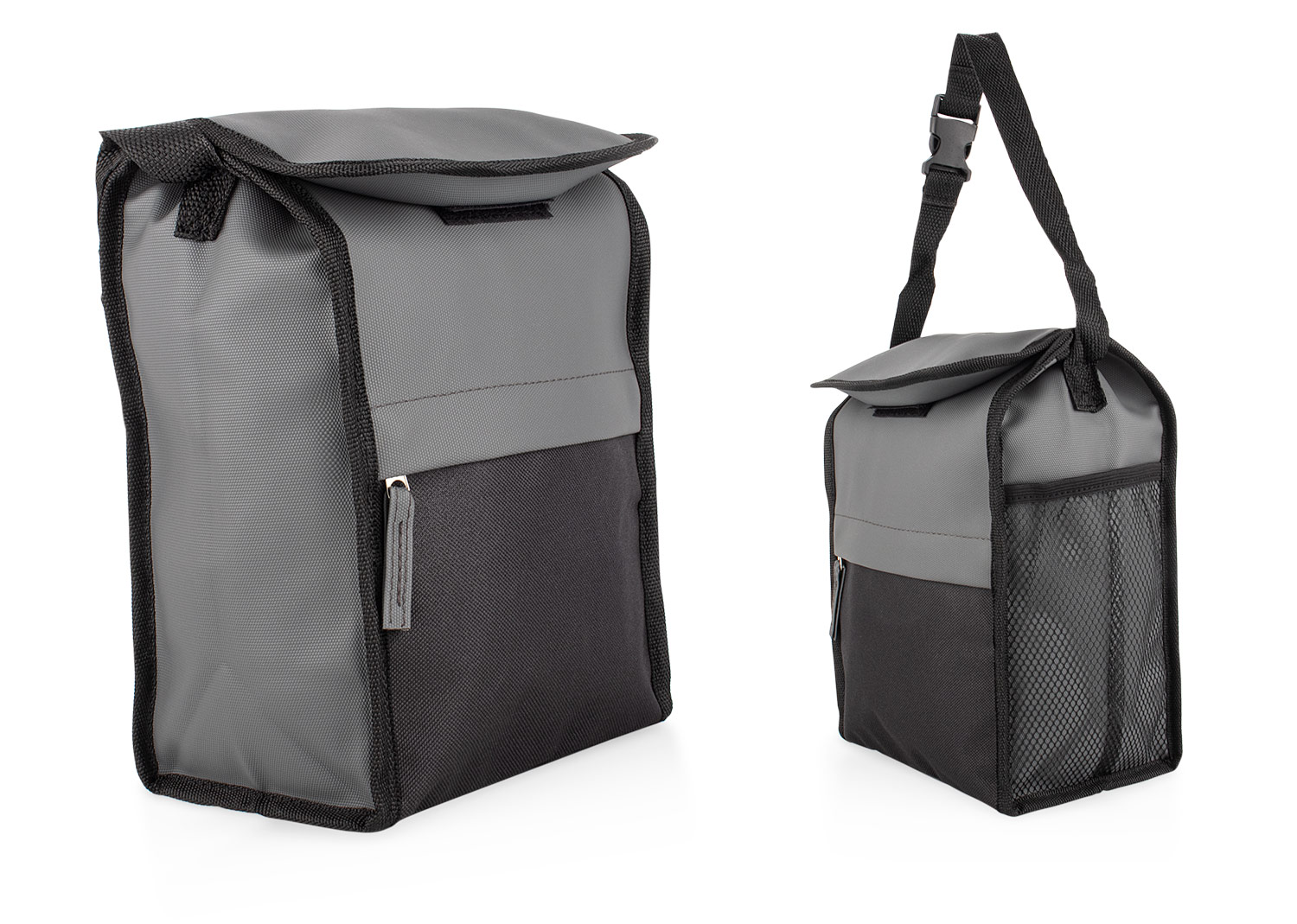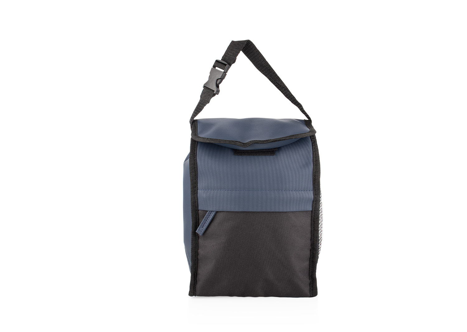 Bolsa térmica fabricada en material reciclado 600D con recubrimiento PU, diseñada para mantener la temperatura de tus alimentos gracias a su forro interior de aluminio acolchado con PE. Cuenta con un bolsillo frontal con cremallera, compartimiento lateral de malla con cierre de contacto, y una correa superior con cierre tipo tridente para facilitar el transporte. Su diseño compacto y funcional la hace ideal para uso diario, oficina o actividades al aire libre.