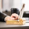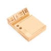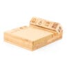 Porta notas de bambú con calendario perpetuo que muestra día, fecha y mes de forma continua, sin necesidad de reemplazo anual. Incluye 4 bloques giratorios de madera (2,3 X 2,3 X 2,3). Contiene 100 hojas de papel tipo kraft (7,6 X 7,6) y compartimentos para bolígrafos o accesorios. Diseño funcional y ecológico para escritorio.