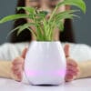 Parlante bluetooth 3W con lámpara led de 7 colores. Espacio para sembrar plantas pequeñas las cuales activan sonidos al tacto. Tiempo de reproducción 4-5 horas. Alcance del bluetooth de 10 metros. Batería de 1200 mAh. De 11.4 x 11.4 x 12 cm.