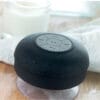 Bluetooth recubierto en caucho, resistente al agua, con chupa de succión en la parte de atrás. De 5,5 x 8.3 cm de diámetro.