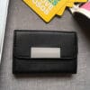 En cuerina con placa metálica. De 10,5 X 6,5 X 1,5 cm.
