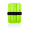Portacomidas rectangular con banda de seguridad negra. Incluye cuchillo y tenedor.