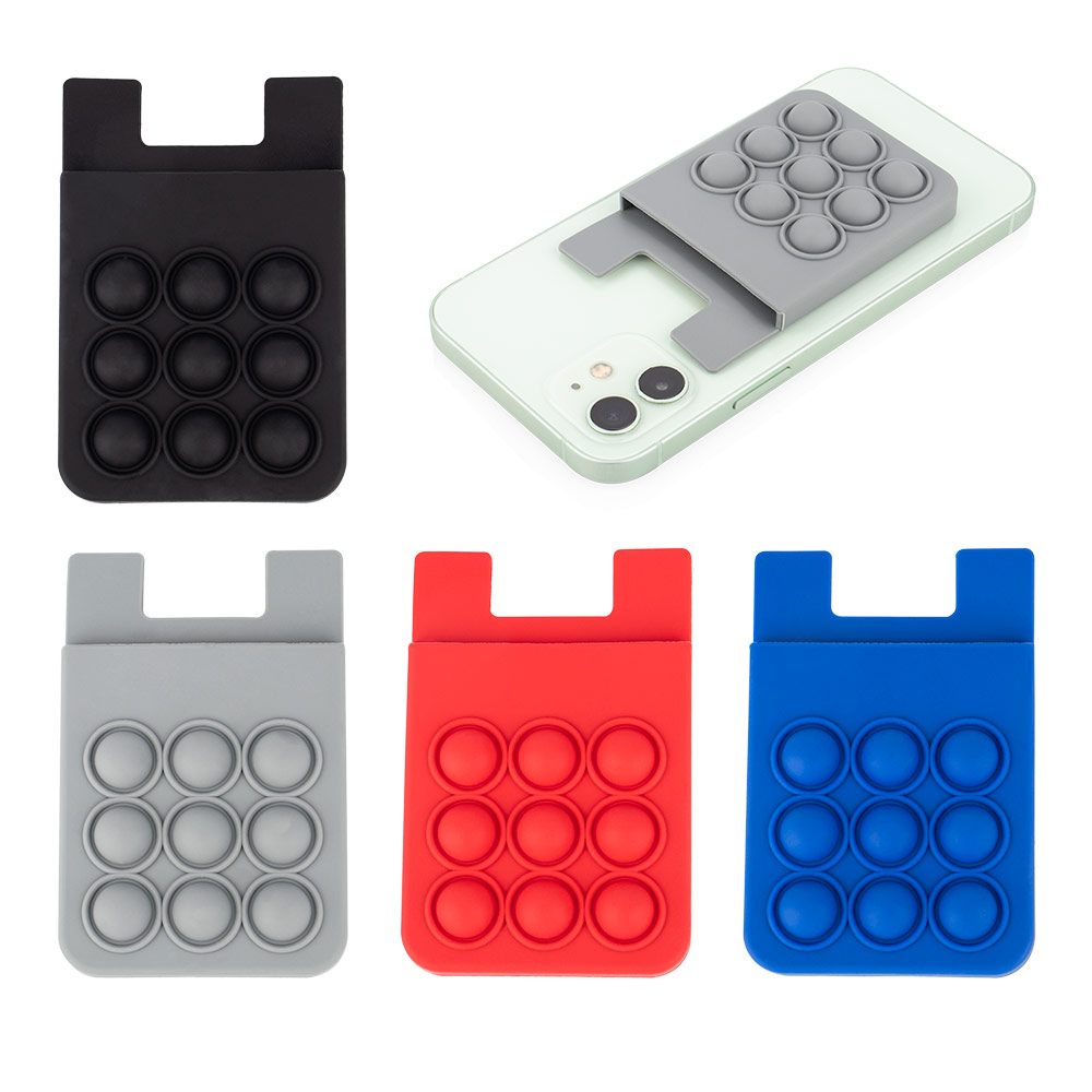 Portatarjetas de silicona diseñado para adherirse fácilmente al celular, ofreciendo una solución práctica para llevar tarjetas esenciales. Incorpora una superficie con burbujas antiestrés, ideal para relajarse en cualquier momento. Su material flexible y resistente garantiza durabilidad y comodidad en el uso diario.