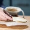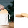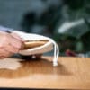 Juego de 4 portavasos hechos en madera de bambú empacados en bolsa de algodón.