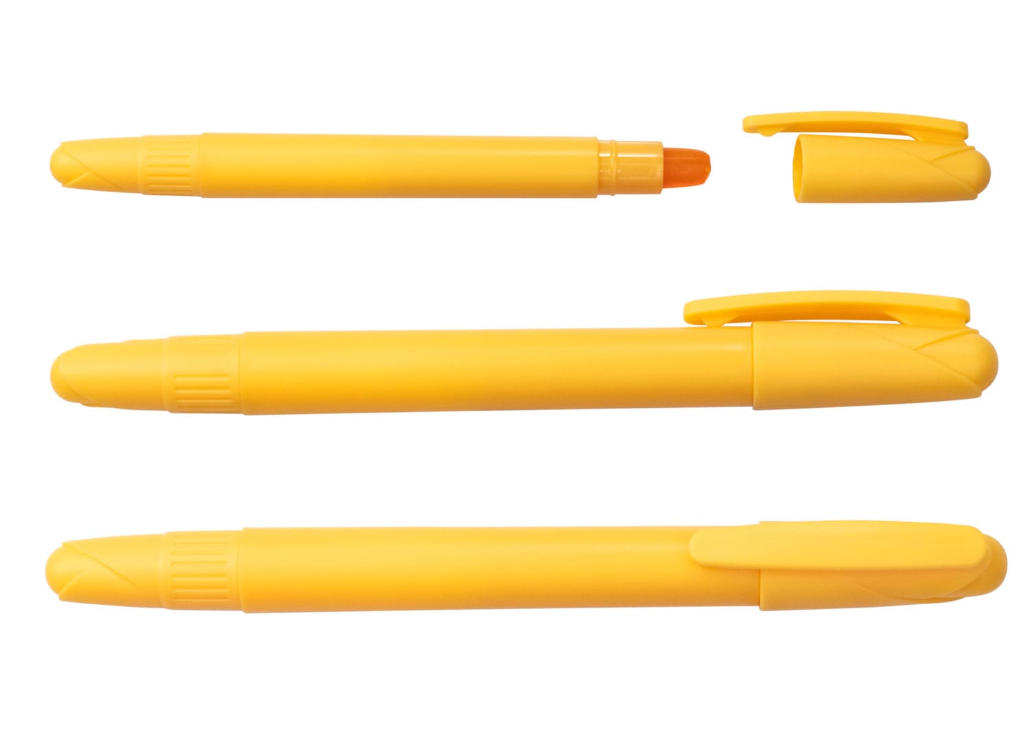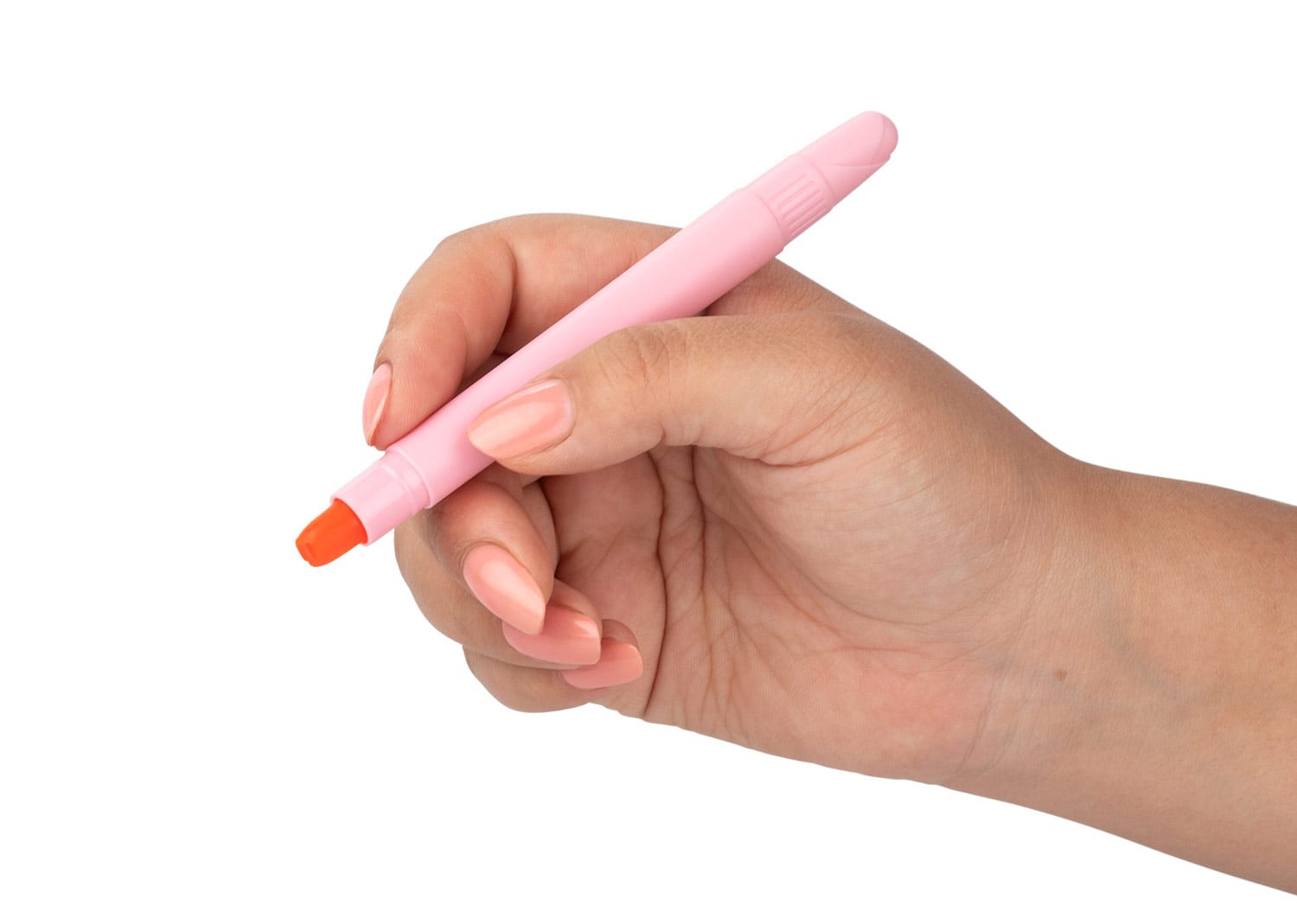 Resaltador con barril y tapa de color sólido. Su punta de cera tipo wax permite un marcado suave y uniforme, sin riesgo de que se seque con el tiempo. Ideal para uso prolongado y ambientes escolares o de oficina.