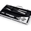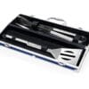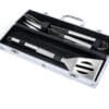 Set BBQ x 3 pcs. Incluye: Pala barbacoa, Tenedor de parrilla y Pinzas de parrilla, con estuche de lujo en aluminio, cierre con botones de presión y manija.