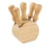 Set de madera, con 1 base con 4 cuchillos y 1 tenedor para quesos. La madera es un producto natural el cual puede presentar variaciones en tonalidades y vetas.