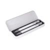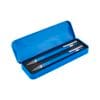 Bolígrafo y lapicera 0.5 mm. Mecanismo pulsador. Incluye estuche metálico.