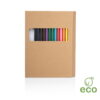 Set de 12 colores y 1 sacapuntas en caja de papel reciclado. Con bandas elásticas para asegurar. Contiene un bloc de hojas blancas para dibujar.