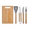 Estuche con asas y broches para cerrar. Incluye tabla de madera, pinzas, tenedor, cuchillo y pala con destapador.