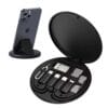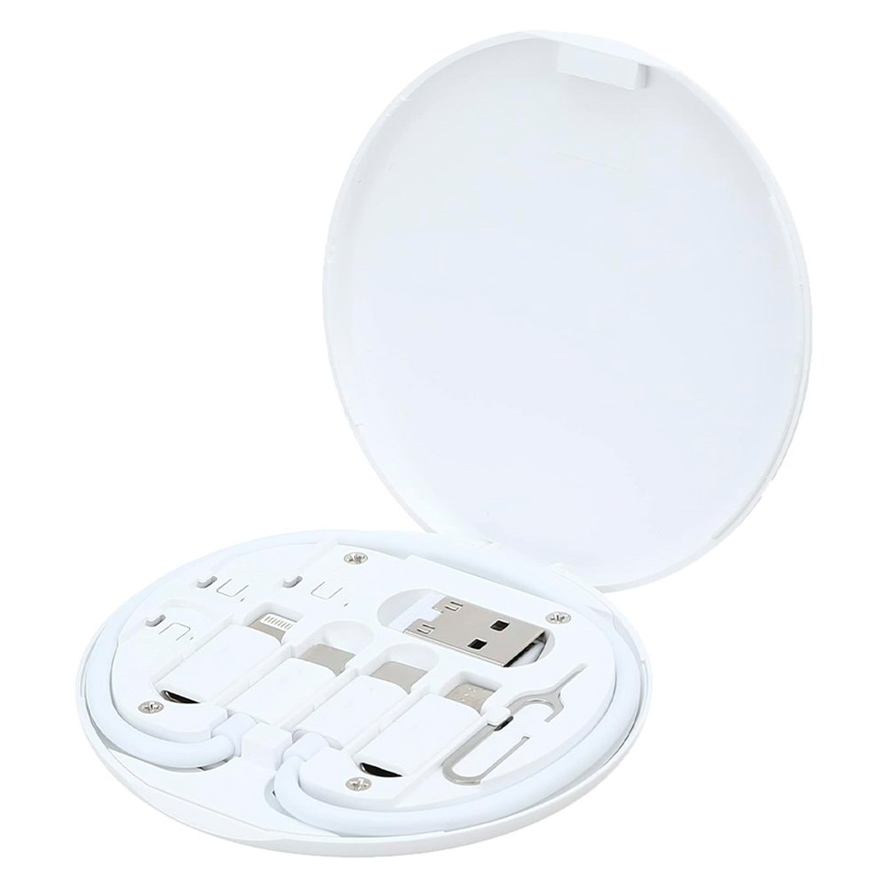 Set para carga con cable principal de doble punta tipo C y cabezales de conector USB y conector Lightning. Incluye pin y espacio para tarjetas SIM (No incluídas). Parte trasera funciona como base sujetadora de teléfono. De 8 x 8 x 1 cm.