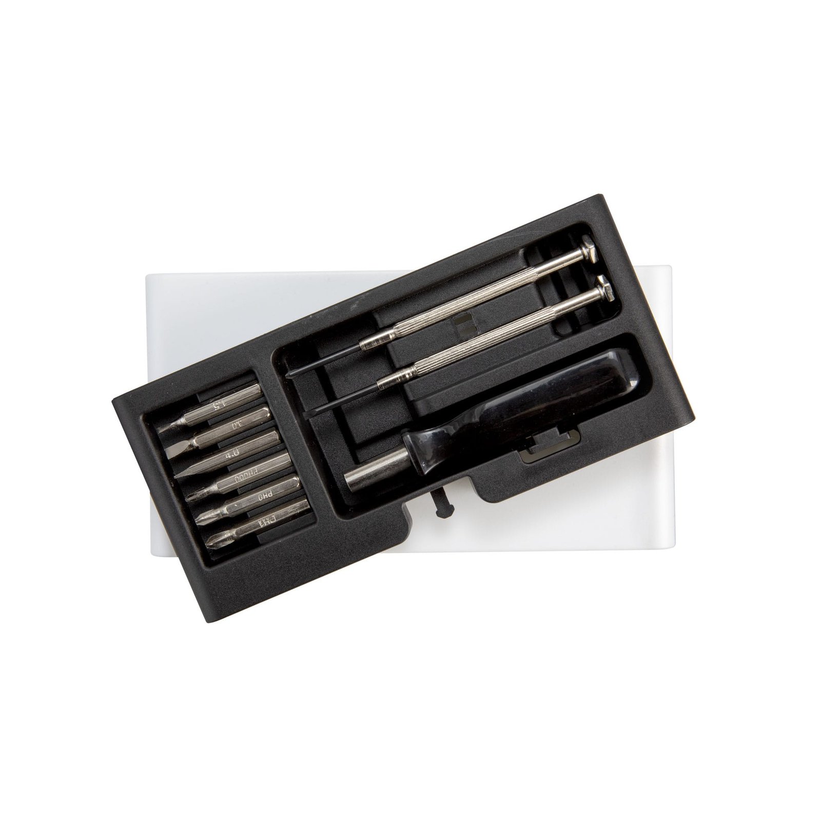 Todas las puntas en un solo estuche.Set de destornilladores. Incluye: 1 mango con punta imantada, 6 puntas diferentes (3 planas: 1,5 ; 3 y 4 mm. y 3 phillips: 0000, 0 y 1mm.) y 2 destornilladores de precisión (1 plano y 1 phillips). Base imantada que permite mantener ordenadas las diferentes puntas. Apertura push. Medidas: 7,3 x 13,7 x 2,1 cm.