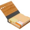 12 x 10,5 x 2 cm. Bambú. Contiene un bloc adhesivo rectangular de papel reciclado, un bloc adhesivo pequeño de color y 3 blocs en forma de flecha. El exterior del estuche es de bambú con detalles de tela, el interior es de plástico con divisiones. Presentación en caja de regalo.