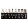Contiene desarmador con 16 puntas y 8 dados diferentes e intercambiables. Incluye estuche.