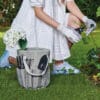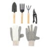 Set de jardín que incluye pinzas de corte, pala ancha, horqueta, rastrillo, guantes de algodón con antiderrapante y bolsa con asa.