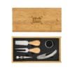 Sorprende con estiloSet de accesorios para vino y corte de quesos. Caja con tapa deslizable de bambú. Tapa / tabla de corte de 24 x 12 x 0,8 cm. Contiene 5 piezas: Destapador sacacorchos (acero inoxidable 420, 11 cm. y 50 g.); Cuchillo y tenedor de queso (acero inoxidable 420 con mango de madera de caucho, 12,8 cm. y 25 g. c/u) Anillo de vino (acero inoxidable 420 y non woven, Ø 3,9 cm.) ; y Tapón de vino (aleación de zinc, 56 g.). Medidas: 24.5 x 13 x 3.3 cm. (caja).