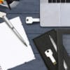 Memoria USB metálica en forma de llave en 8 GB y bolígrafo metálico.