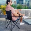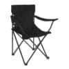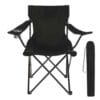 Silla plegable de fácil armado con reposabrazos, porta vasos de malla y funda con jareta y correa.