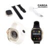 Este reloj inteligente cuenta con pantalla táctil, sincronización automática de hora, monitoreo de pasos, distancia, calorías, frecuencia cardíaca, presión arterial y oxígeno. Incluye modos deportivos, seguimiento de sueño, alertas de llamadas y mensajes, fotografía remota, recordatorios de inactividad y alarmas. Compatible con la app ZFit para configuración avanzada y notificaciones de WhatsApp, SMS, llamadas y más. No es resistente al agua. Cuenta con correa removible que se ajusta con presión.