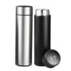 En acero inoxidable doble pared con tapa medidora de temperatura y canastilla para infusiones. Aislamiento térmico para bebidas frías entre 7-8 horas y calientes entre 4-6 horas aprox.