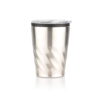 Mug de doble pared, con acero inoxidable en el exterior para un diseño ergonómico y bien estilizado. Interior de Polipropileno. La tapa está hecha de Poliestireno y cuenta con una pequeña seguro de corredera antisalpicaduras. Apto para bebidas frías o calientes, con revestimiento negro y base antideslizante. Libre de BPA. Capacidad de 300 ml (10 oz).